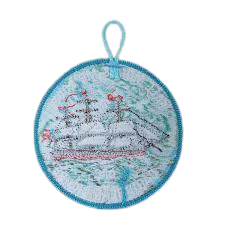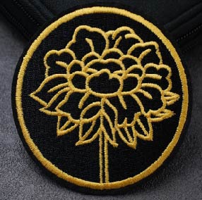 When the patch is being created, one or more pins are placed inside the layers of backing, twill, and thread, allowing the patch to be used as a pin or brooch. Once pinned through the garment, butterfly clutches (included) are used to secure the patch.