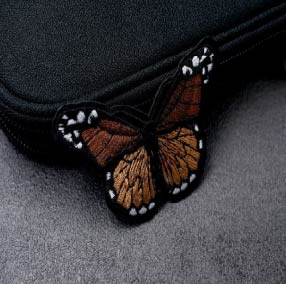 When the patch is being created, one or more pins are placed inside the layers of backing, twill, and thread, allowing the patch to be used as a pin or brooch. Once pinned through the garment, butterfly clutches (included) are used to secure the patch.